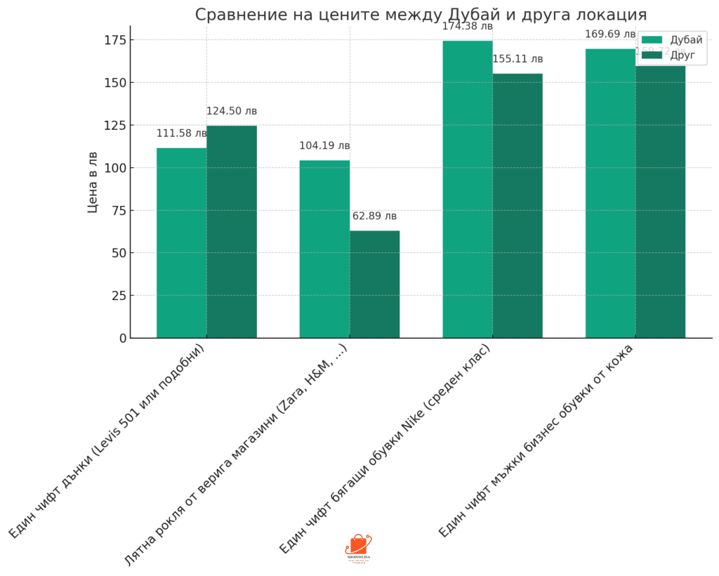 Ето стълбовидната диаграма, сравняваща цените на дрехите и обувките в Дубай и в други градове, с етикети на български език. Всяка двойка стълбчета представя цената на даден артикул на двете места, като лявото стълбче показва цената в Дубай, а дясното – цената в другото място. Цените са посочени на всеки бар за по-голяма яснота.