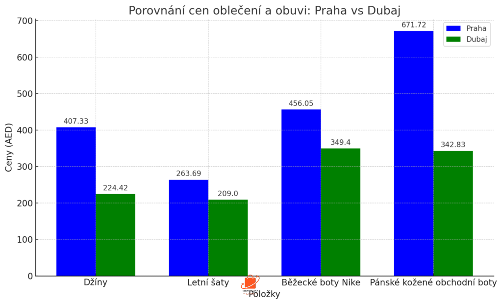 | Položka | Cena v Praze (Kč) | Cena v Dubaji (Kč) | Rozdíl v cenách (%) |
